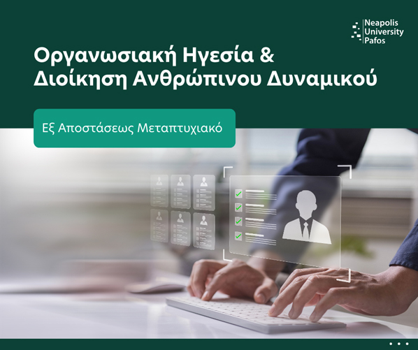 Το Μεταπτυχιακό Πρόγραμμα Σπουδών στην Οργανωσιακή Ηγεσία και Διοίκηση Ανθρώπινου Δυναμικού του Πανεπιστημίου Νεάπολις Πάφος αποτελεί ένα σύγχρονο, διεπιστημονικό και εξ αποστάσεως πρόγραμμα, σχεδιασμένο για να ανταποκριθεί στις ανάγκες των σύγχρονων οργανισμών και των ανθρώπων που τους διοικούν.