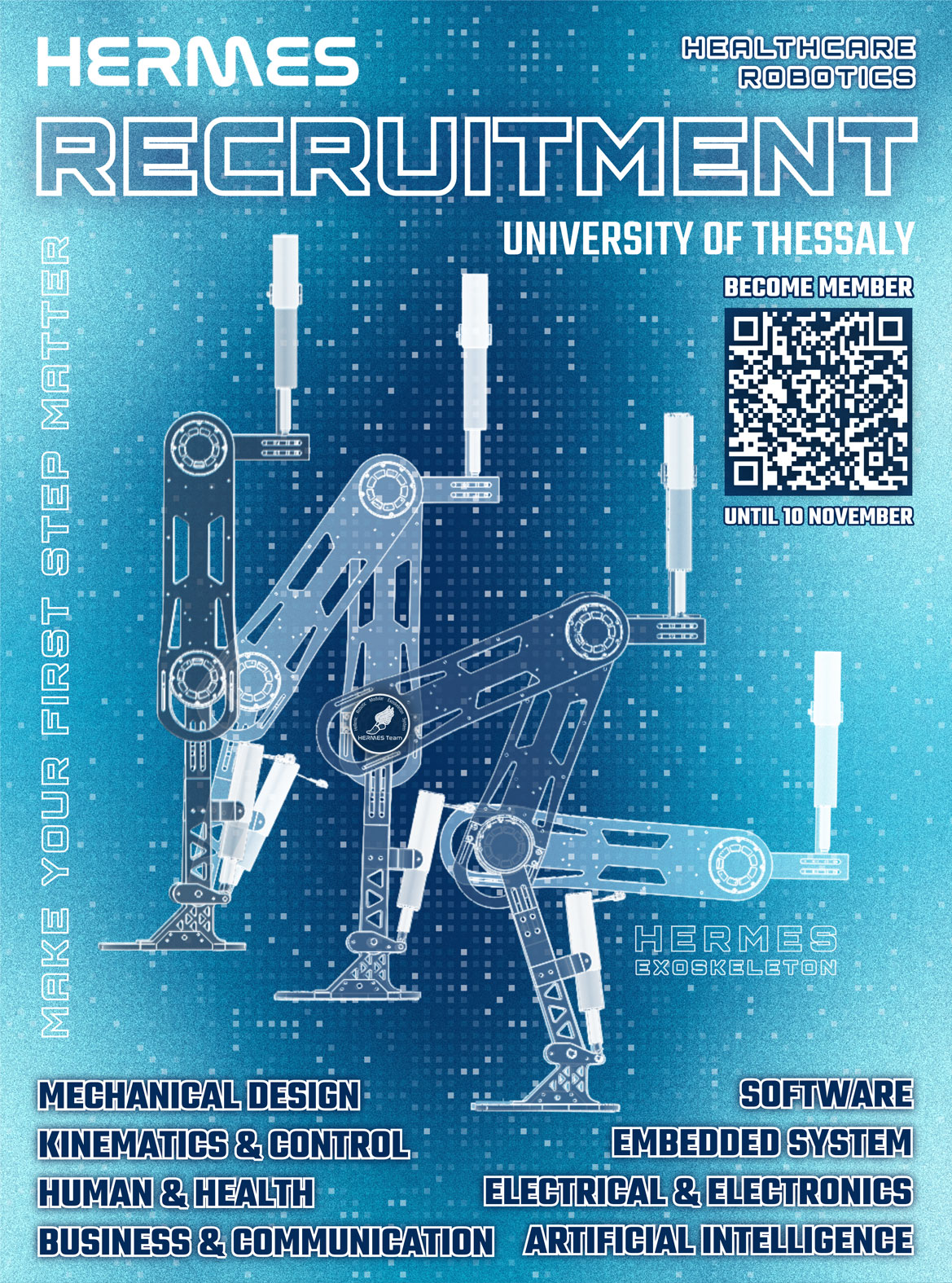 Η HERMES Team, η φοιτητική ερευνητική ομάδα του Πανεπιστημίου Θεσσαλίας, προσκαλεί φοιτητές και νέους ερευνητές να γίνουν μέλη της μεγαλύτερης φοιτητικής ομάδας ρομποτικής για ιατρικές εφαρμογές στην Ελλάδα.