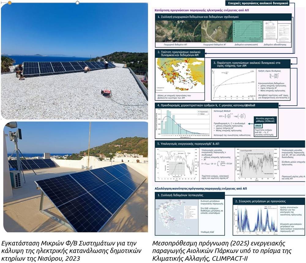 Ορισμένα ενδεικτικά αποτελέσματα των Ερευνητικών προσπαθειών του Τμήματος με πραγματικές εφαρμογές σε λειτουργία αποτελεί ο πρώτος σε λειτουργία (2018-…) Υβριδικός Σταθμός της Τήλου (με εγκατάσταση ανεμογεννήτριας, φωτοβολταϊκών, αποθήκευσης ενέργειας και διαχείρισης παραγωγής-ζήτησης) στο πλαίσιο Horizon 2020, το σύστημα βέλτιστης διαχείρισης υδάτινων πόρων της Τήλου με την αξιοποίηση των ΑΠΕ στο πλαίσιο του Ερευνώ-Δημιουργώ-Καινοτομώ (DARWEN), ο ενεργειακός σχεδιασμός της Νισύρου (ZEN NESOI-Horizon), η διερεύνηση εγκατάστασης κυματικής μηχανής σε Χάλκη και Αντικύθηρα (NEPTUNUS-NESOI-Horizon) αλλά και η Ίδρυση ενεργειακής κοινότητας σε Κύθηρα, Χαλάνδρι και Νίσυρο, καθώς και η δημιουργία Αυτόνομου Φωτοβολταϊκού Σταθμού με Αποθήκευση Ενέργειας στα Αντικύθηρα για κάλυψη των ενεργειακών αναγκών του Ευρωπαϊκού Παρατηρητηρίου για την Κλιματική Αλλαγή (ΠΑΓΓΑΙΑ) μέσα από την Εμβληματική Δράση ΝΗΣΟΣ.