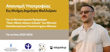 Με αίσθημα τιμής και συγκίνησης, το eduguide ανακοινώνει την απονομή της Υποτροφίας εις μνήμη Δημήτρη Φαλλιέρου στον Ευάγγελο Παναγιάρη Μαλέα, με σκοπό τη φοίτησή του στο Διιδρυματικό Πρόγραμμα Μεταπτυχιακών Σπουδών «Ζώα: Ηθική, Δίκαιο, Ευζωία» του Εθνικού και Καποδιστριακού Πανεπιστημίου Αθηνών.