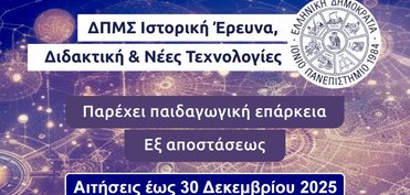 Το Τμήμα Ιστορίας & Ψηφιακών Ανθρωπιστικών Επιστημών σε συνεργασία με το Τμήμα Πληροφορικής του Ιονίου Πανεπιστημίου ανακοινώνουν τη λειτουργία του διεπιστημονικού Μεταπτυχιακού Προγράμματος Σπουδών (ΜΔΕ/Διπλωματούχων & Διδακτορικού) με τίτλο «Ιστορική Έρευνα, Διδακτική & Νέες Τεχνολογίες», το οποίο ξεκινά για το ακαδημαϊκό έτος 2025-2026.